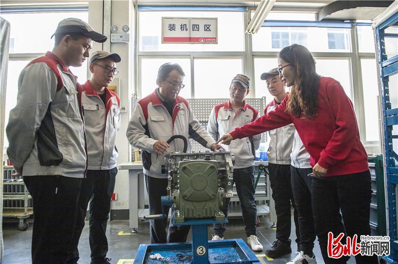 中原一浩(左三)给同事们讲解发动机热效率提升原理。河北日报记者 田明摄